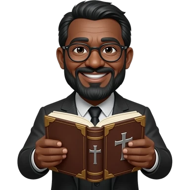 wise old man with greying black hair black skin glasses smile with book that has a cross on it emoji
