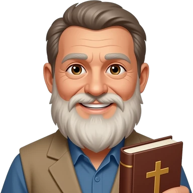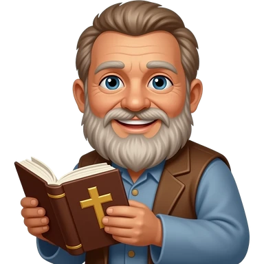 wise old man with greying brown hair beard eyes smile with book that has a cross on it emoji