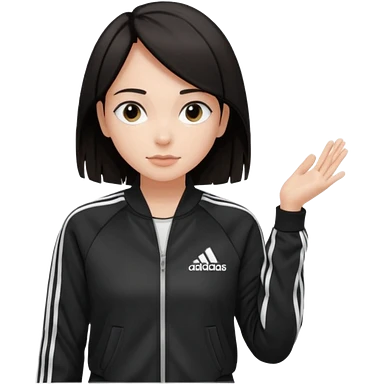 A girl with medium length, dark hair, fair skin. The style is a layered cut that falls around her shoulders. wore black Adidas track jacket with white stripes on the sleeves. It has a full zipper down the front, a stand-up collar, and the Adidas logo on the right chest emoji emoji