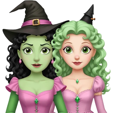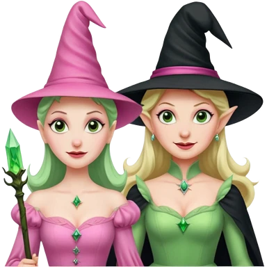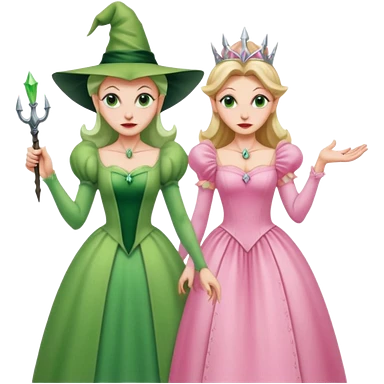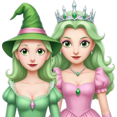 make an emoji of the green wicked witch standind behind the good witch Glinda and being overly protective looking angry and glinda looking happy emoji