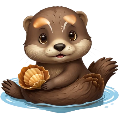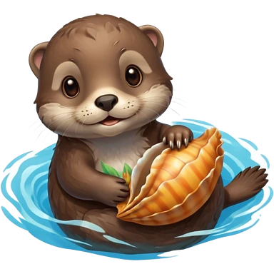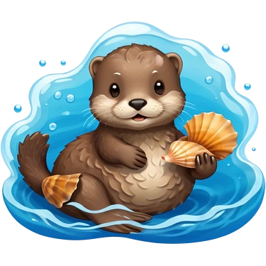 adorable otter floating on clearly visible blue water with waves, holding a shell emoji