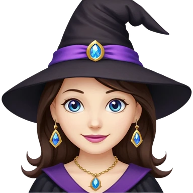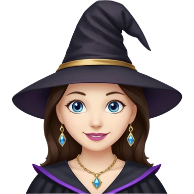 Witchy brunette haired blue eyed white girl with a witty smile a gold necklace and a black witch hat with a purple bow emoji