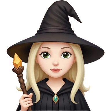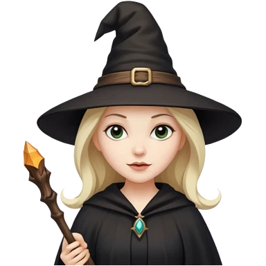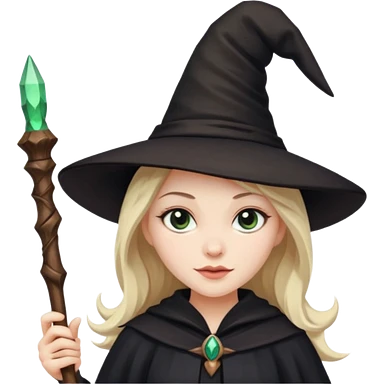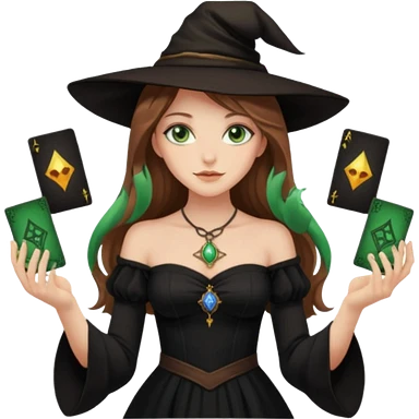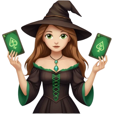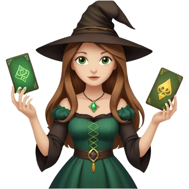 witch girl with long light brown hair and green eyes and Tarot cards without hat and in sexy dress emoji