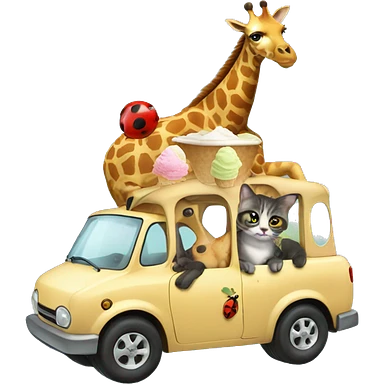 a cat riding a giraffe eating ice cream with a ladybug on top of the cat emoji
