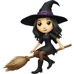 Scarry witch flying on a broom facing right throwing candy. emoji