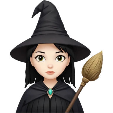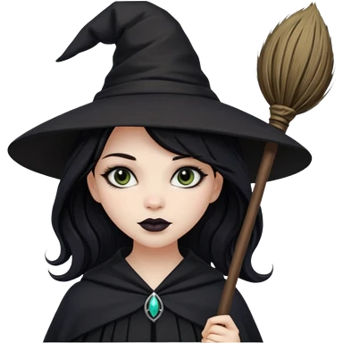 elphaba wicked witch with broom close up, evil dark curly hair, green skin, thick lips, cheekbones, smirk evil menacing cythia erivo emoji