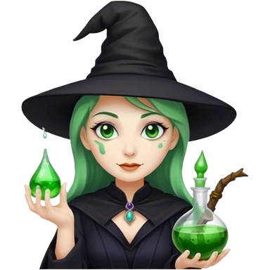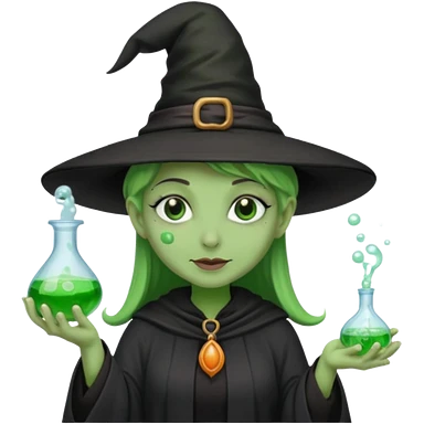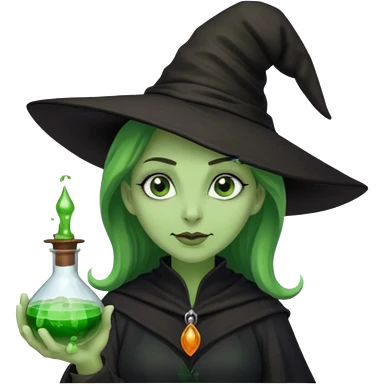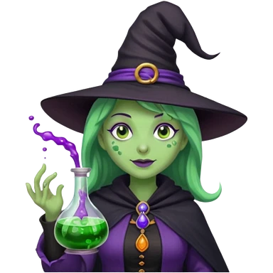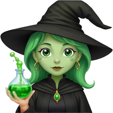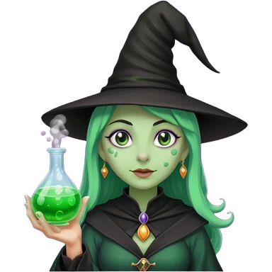 Witch with Green Skin – long-nosed witch in black hat holding potion emoji | AI Emoji Generator