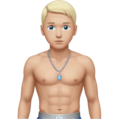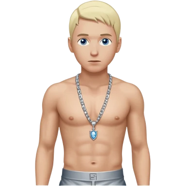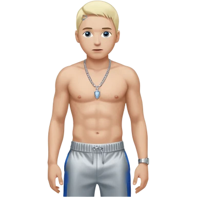 Eminem with blonde hair, shirtless with necklace, metallic silver pants, blue eyes emoji