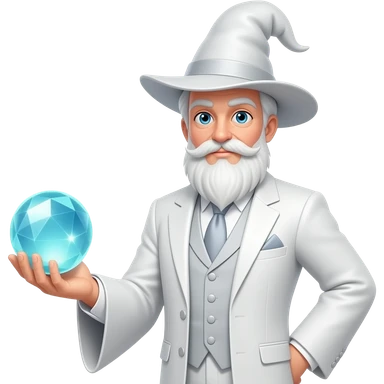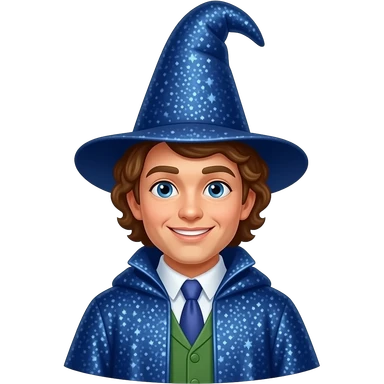 Wizard blue and purple and Grey robe and wizard hat point to one side with brim around holding a staff smiling brown eyes with a calico cat perched on shoulder emoji