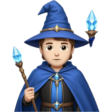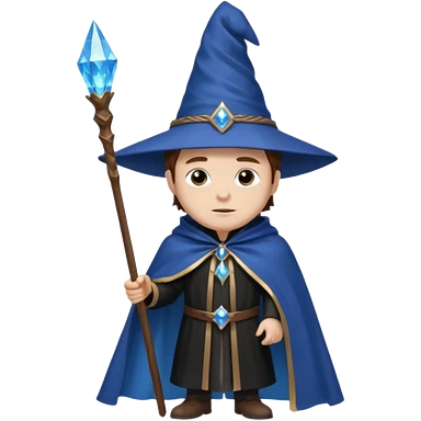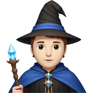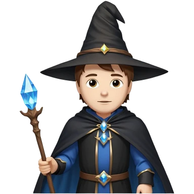 A white-skinned man with brown hair stands in sharp black clothing. He wears a pointed wizard hat and cape, holding a wooden staff crowned with a glowing blue crystal. His calm expression and steady posture suggest quiet mastery and a blend of magic, mystery, and modern elegance. emoji