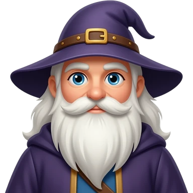 Wizard blue and purple and Grey robe and wizard hat point to one side with brim around holding a staff smiling brown eyes with a calico cat perched on shoulder emoji