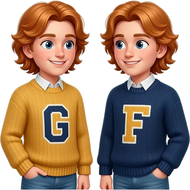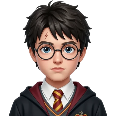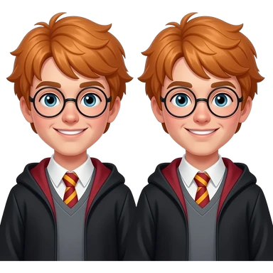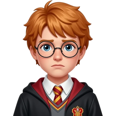 wizard young man, 18-19 years old, ginger hair, light freckles, serious slightly worried expression, wearing school robe and tie, gold and red colors, head-and-shoulders portrait, centered, 3D glossy emoji style, clean background emoji | AI Emoji Generator