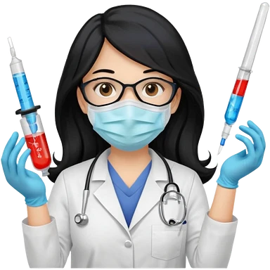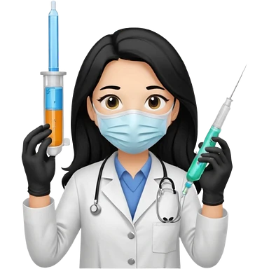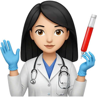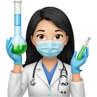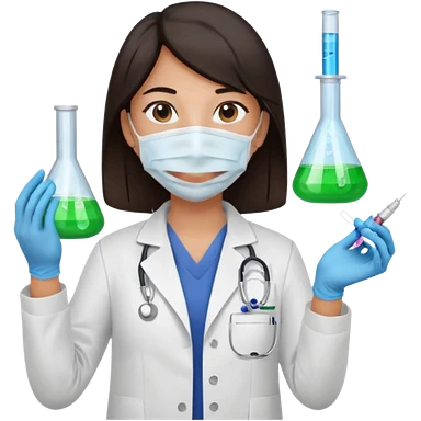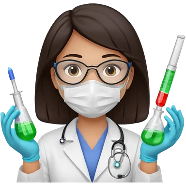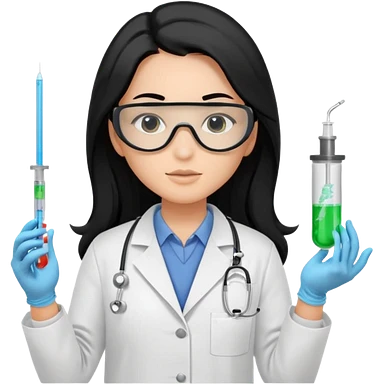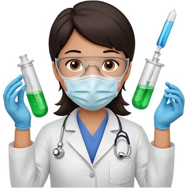 medica con guantes y mascarilla e insumos laboratorio jeringa tubos pelo negro largo triguella emoji