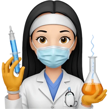 laboratorista con guantes y mascarilla jeringa tubos pelo negro largo triguella emoji