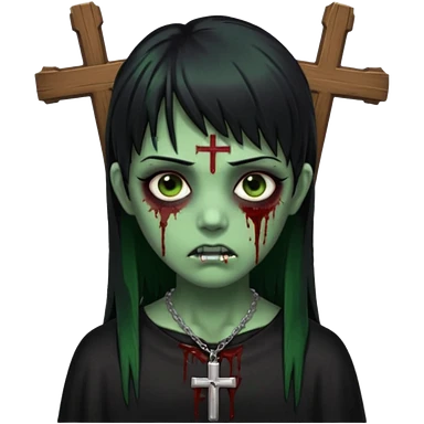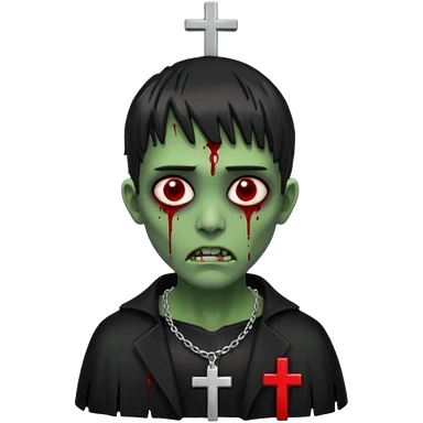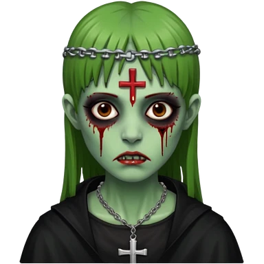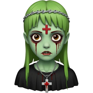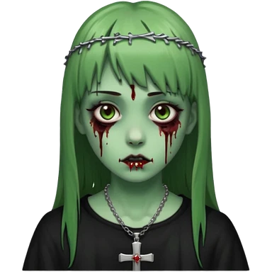 zumbi verde com olhos vermelhos sangrando e franja roupa preta e um crucifixo como colar emoji