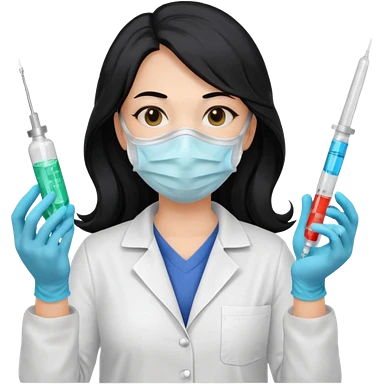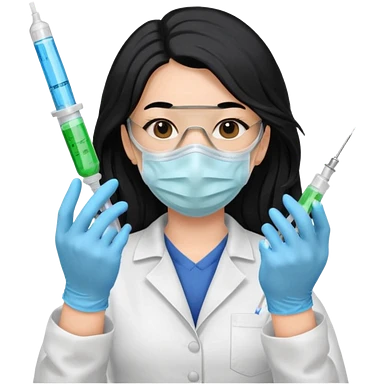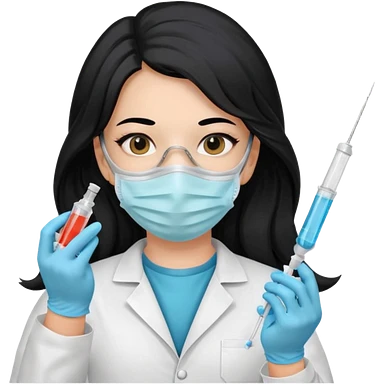 laboratorista con guantes rosa y mascarilla rosa jeringa tubos pelo negro largo triguella sin lentes pelo lacio negro y largo emoji