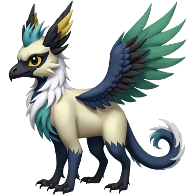 Dark-deep-colored gryphon-Trico-Nargacuga-Absol-Leafeon-Sprigatito-Silvally-fusion-hybrid with a long tufted tail, black beak, black claws, black tail, majestic, realistic, furry (full body) emoji