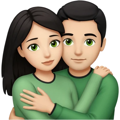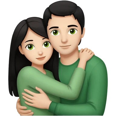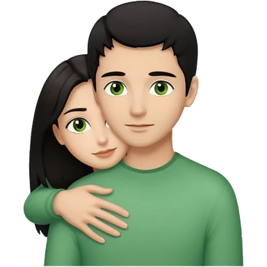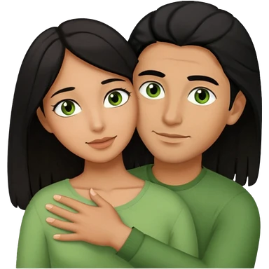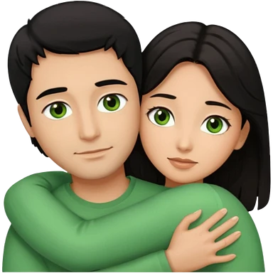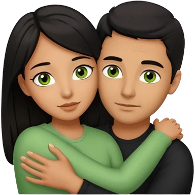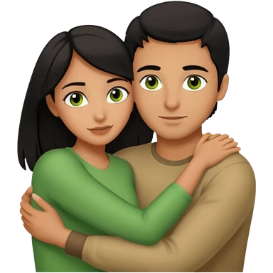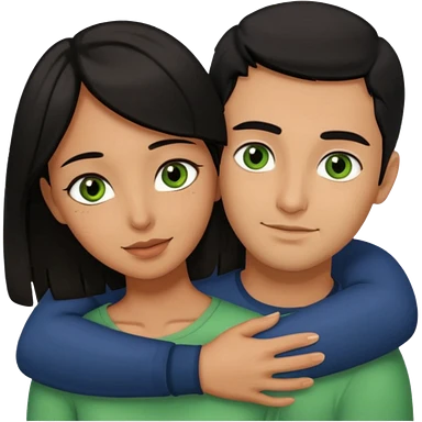 Woman with brown eyes and black hair hugging a man with green eyes and brown hair emoji