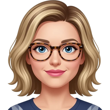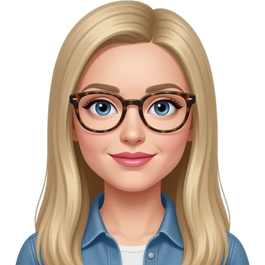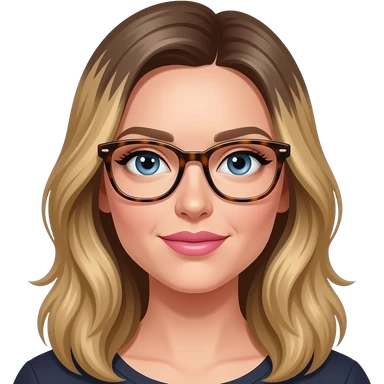 woman with dirty blond highlighted hair, tortise shell glasses, pink lips, and blue eyes emoji