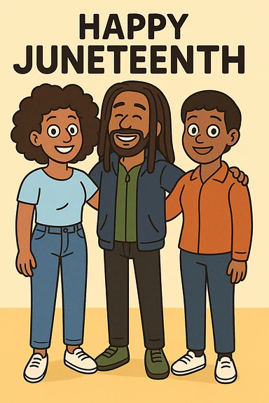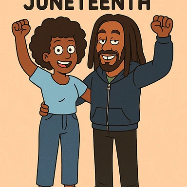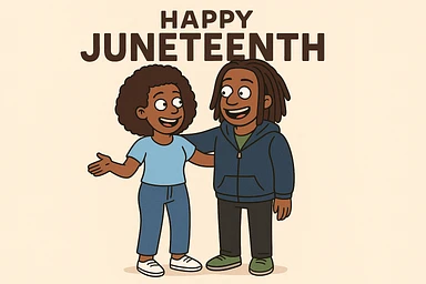 A woman Kinky hair light blue shirt blue jeans white shoes boy Dreadlocks dark brown hair green shuts navy blue zip up hoodie black jeans green shoes Bob Marley Vanessa Nakate Mae Jemison Happy JUNETEENTH emoji