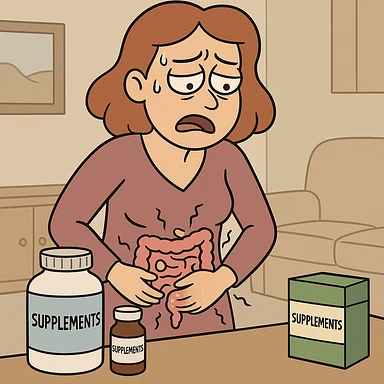 woman with intestinal dysbiosis caused by wrong supplementation, educational cartoon style, suffering expression, simplified clinical details, home environment, visible supplement packages emoji