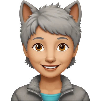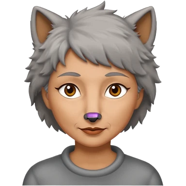 woman 50 years old, short grey fluffy wolf-cut hair, tannes skin and brown eyes emoji