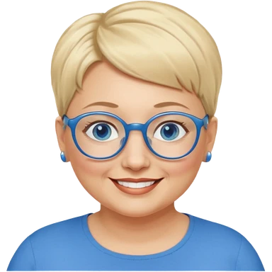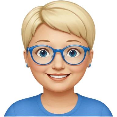 woman 50 years old, very short blonde hair, blue eyes and blue round glasses smile and overweight emoji