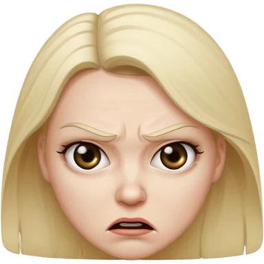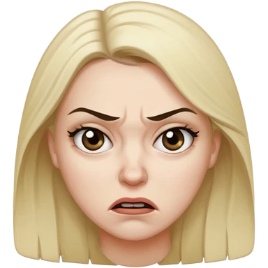 woman with long curly blond hair, brown eyes, wearing an off-shoulder top, studying emoji