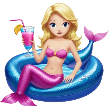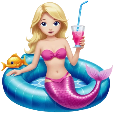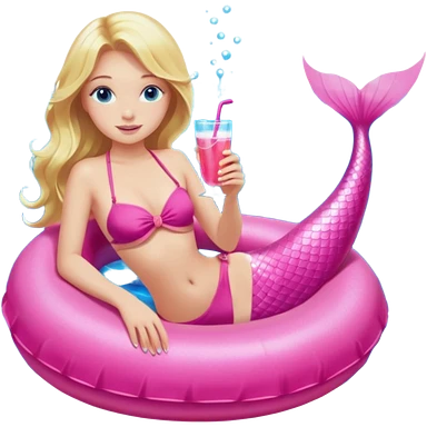 woman who is a mermaid with blonde hair and blue eyes sitting in a pink pool tube in a blue pool sipping a drink wearing a pink bikini top and a pink mermaid tail emoji