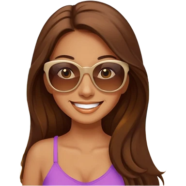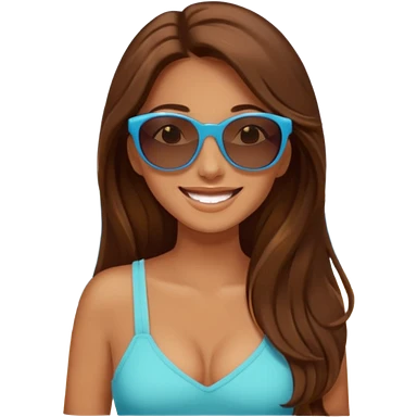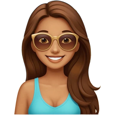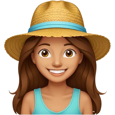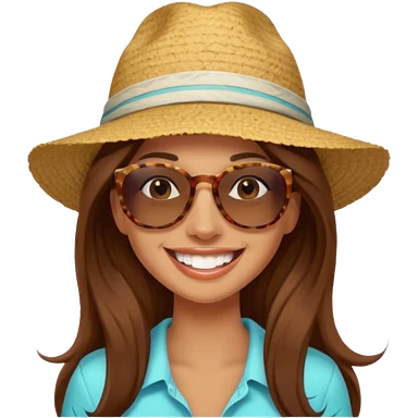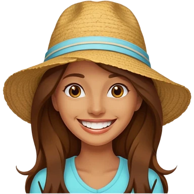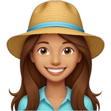 woman with long brown hair on vacation, happy and smilling with theeth and a hat emoji