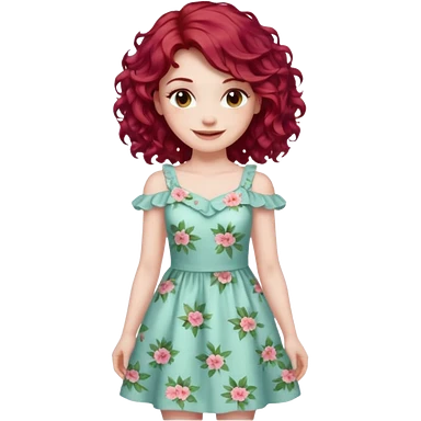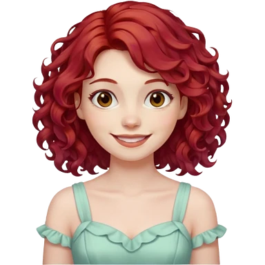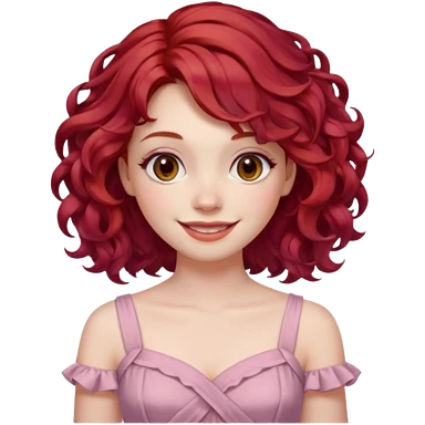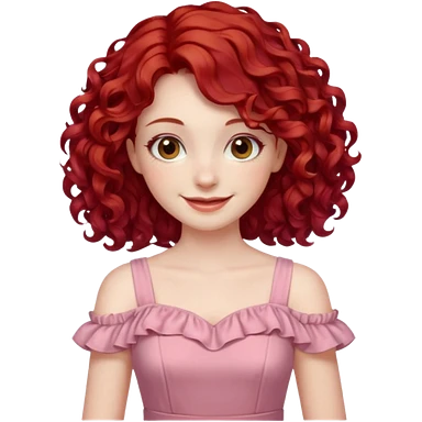 woman with shoulder length curly cherry red hair with brown eyes and pale skin smiling. pastel dress emoji