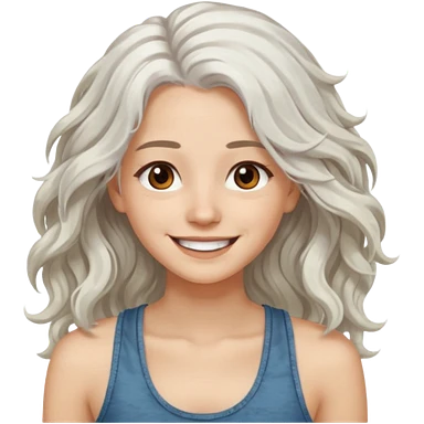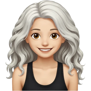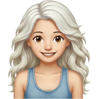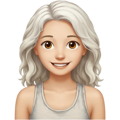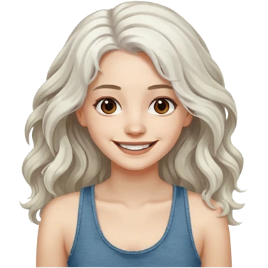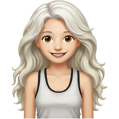 woman with wavy long white hair and brown eyes. smiling in a grunge tanktop emoji