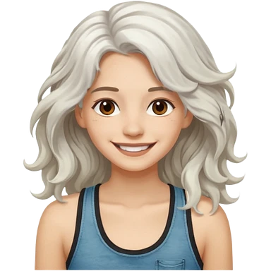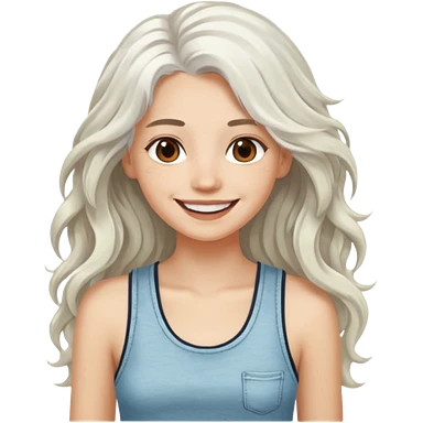 woman with wavy long white hair and brown eyes. smiling in a grunge tanktop. pale skin. emoji