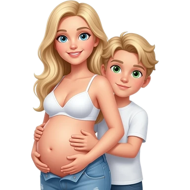 Woman with long blonde hair, and light blue eyes, with pregnant belly wearing white bra and light blue baggy jeans, with boy with blonde hair and green eyes standing behind woman hugging her from behind emoji