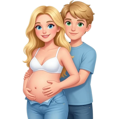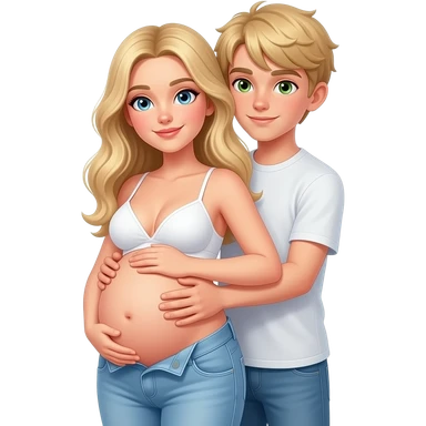Woman with long blonde hair, and light blue eyes, with small pregnant belly wearing white bra and light blue baggy jeans, with tall boy with blonde hair and green eyes standing behind woman hugging her from behind emoji