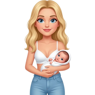 Woman with long blonde hair, and light blue eyes, wearing white bra and light blue baggy jeans, holding newborn girl emoji