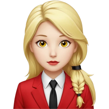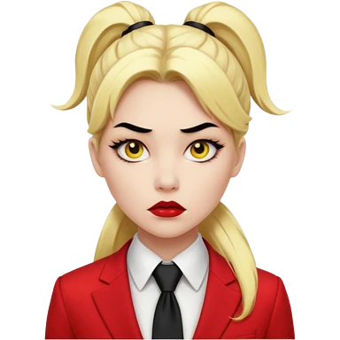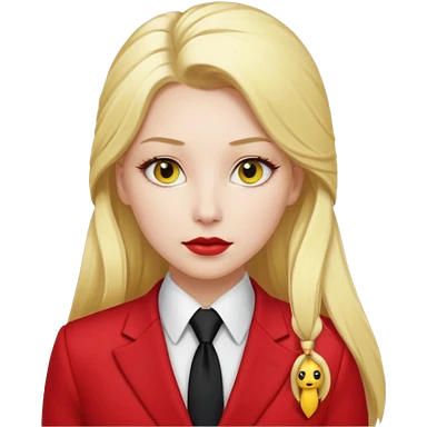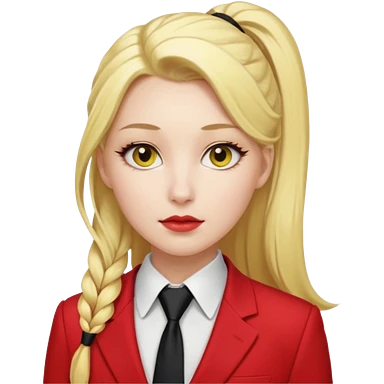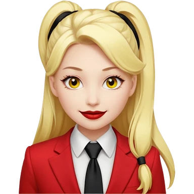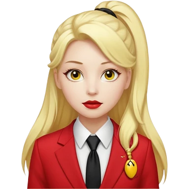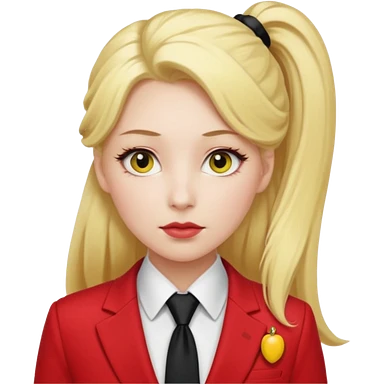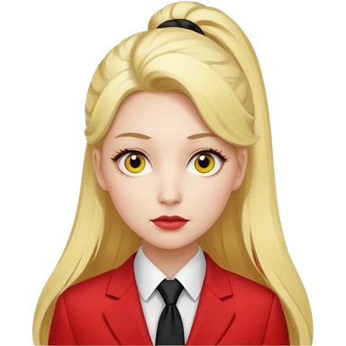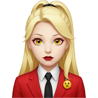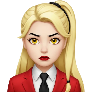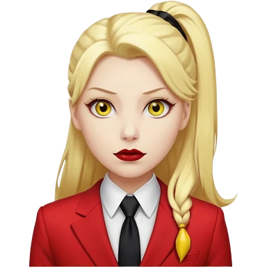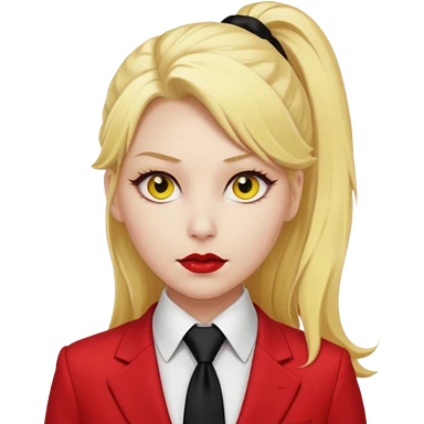 Woman with porcelain white skin, thick blonde hair that's in a thick, long ponytail, has a black nose, yellow scleras, red pupils, and a red suit with a black tie. emoji