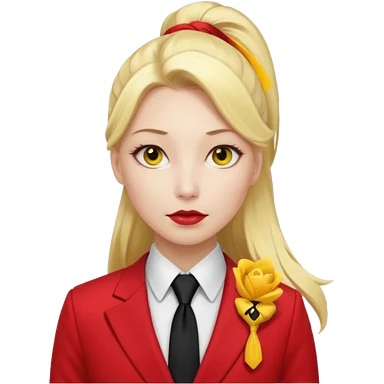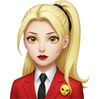 Woman with porcelain white skin, thick blonde hair that's in a thick, long ponytail, has a black tipped nose, yellow scleras, red pupils, and a red suit with a black tie. emoji