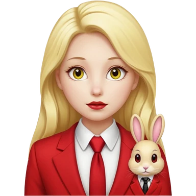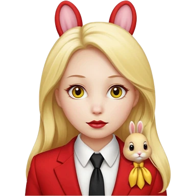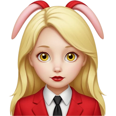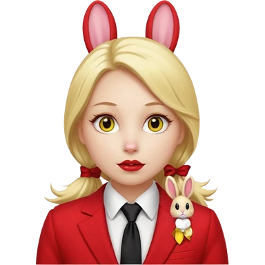 Woman with porcelain white skin, thick blonde hair that's in a thick, long ponytail, has the nose of a bunny, yellow scleras, red pupils, and a red suit with a black tie. emoji