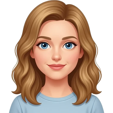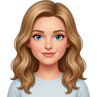 woman, blue eyes, late twenties, mousey blonde hair, long wavy hair, sweatshirt emoji
