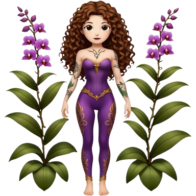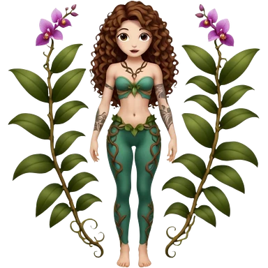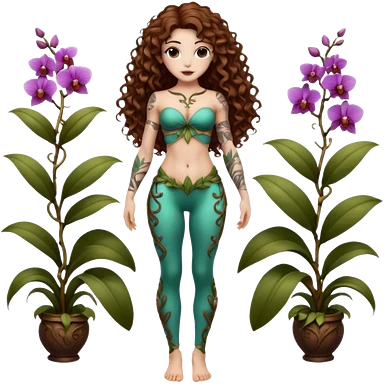 full body woman long curly brown hair brown eyes white skin tattoos muscular build orchid fairy bodice and vine leggings emoji