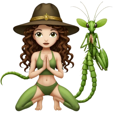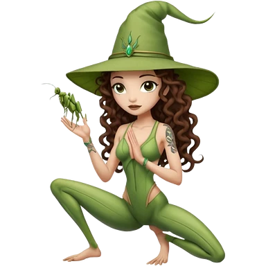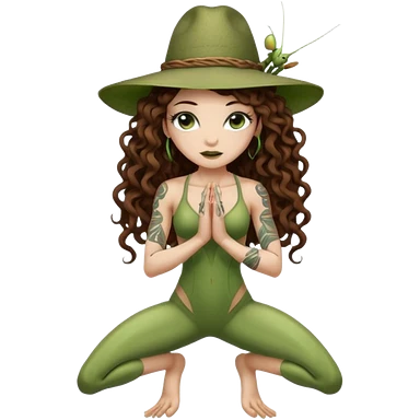 full body woman long curly brown hair brown eyes white skin tattoos muscular build praying mantis hat couture emoji