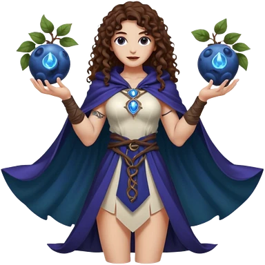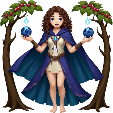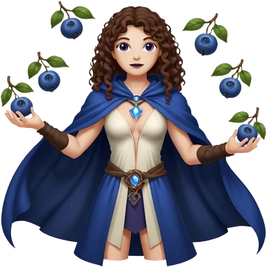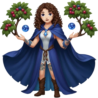 full body woman long curly brown hair brown eyes white skin tattoos muscular build blueberry forest mage cloak, glowing berry orbs floating emoji