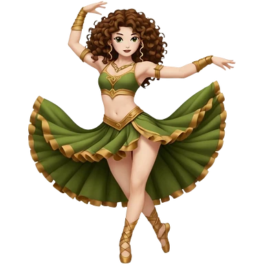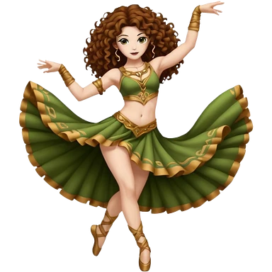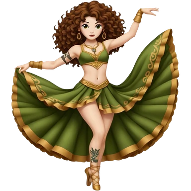 full body woman long curly brown hair brown eyes white skin tattoos muscular build moss silk dancer costume, mid spin emoji