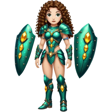 full body woman long curly brown hair brown eyes white skin tattoos muscular build covered in jewel beetle armor pieces emoji