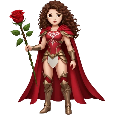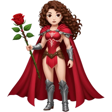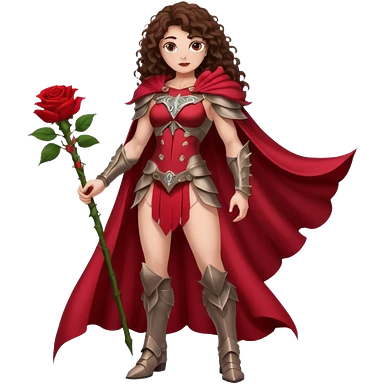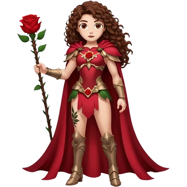 full body woman long curly brown hair brown eyes white skin tattoos muscular build rose thorn armor and petal cape emoji