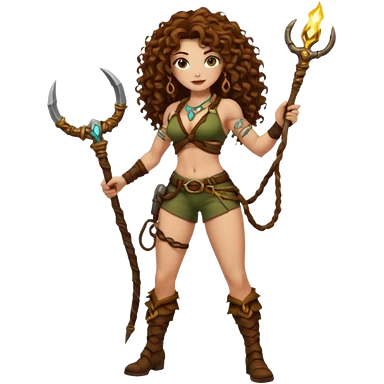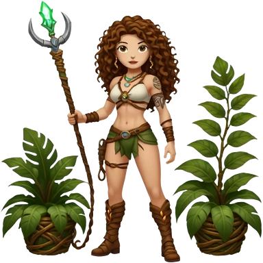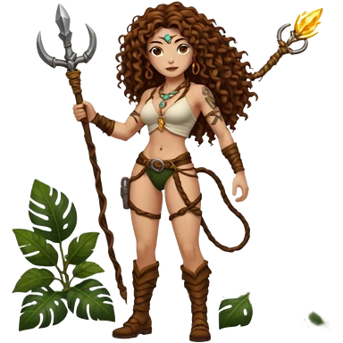 full body woman long curly brown hair brown eyes white skin tattoos muscular build jungle treasure hunter outfit, vine whip, glowing relic emoji