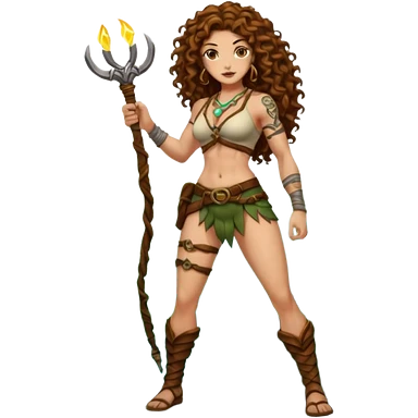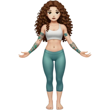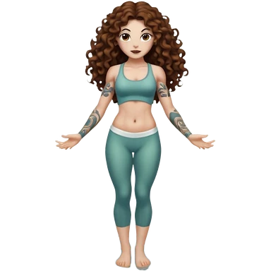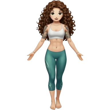 full body woman long curly brown hair brown eyes white skin tattoos muscular build lily pond spirit stance emoji