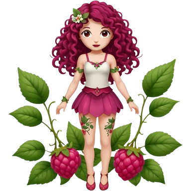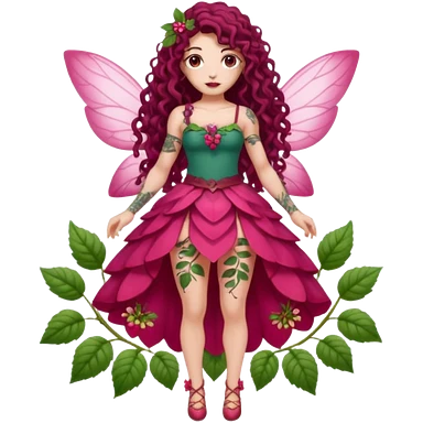 full body woman long curly brown hair brown eyes white skin tattoos muscular build raspberry fairy outfit, petal skirt, thigh vines emoji