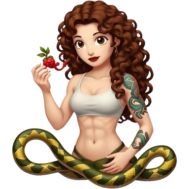 full body woman long curly brown hair brown eyes white skin tattoos muscular build feeding snake a glowing berry emoji